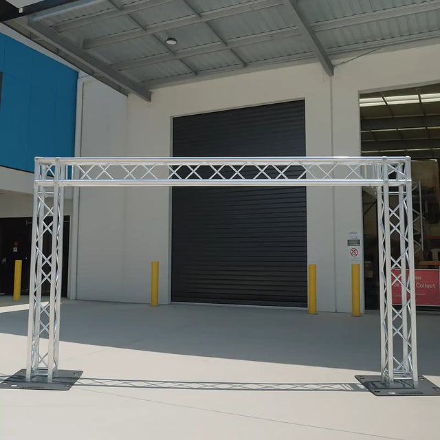 Truss arch includes upright poles (290mm box truss), cube corners (290mm box truss), cross bar (290mm box truss), Steel bases (800x800mm steel base plates) and all spigots, pins & clips.