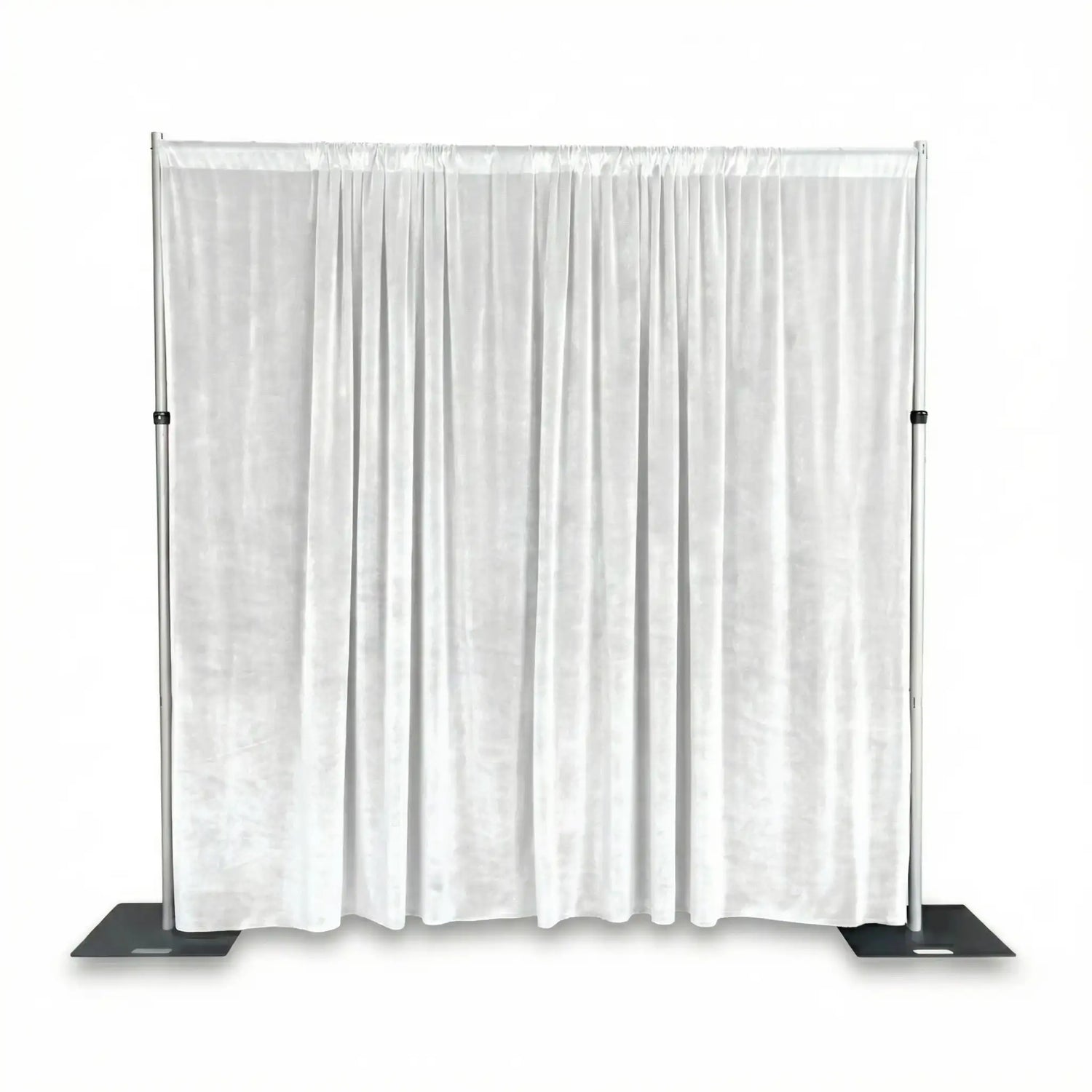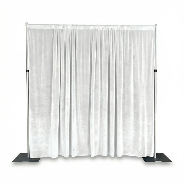 The included 300gsm white velvet drape (3.15m across x 3m drop) delivers a high-quality, light-absorbing finish, perfect for hiding event infrastructure, creating partitions, or enhancing visual presentations. The steel base plates feature multiple mounting points, giving you the flexibility to position the upright poles where needed.